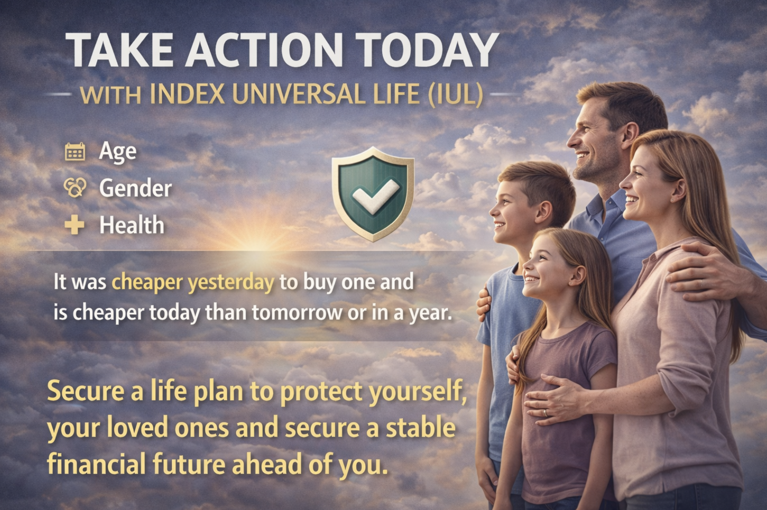 Index Universal Life (IUL) is a versatile insurance product, with pricing based on your age, gender, and health. Acting sooner means locking in lower rates—today is more affordable than tomorrow, and tomorrow is less than next year. Take control now to secure a life plan that safeguards you, your loved ones, and your financial future.